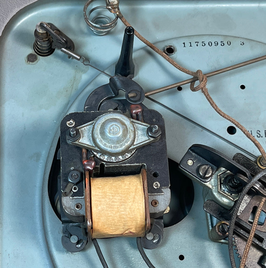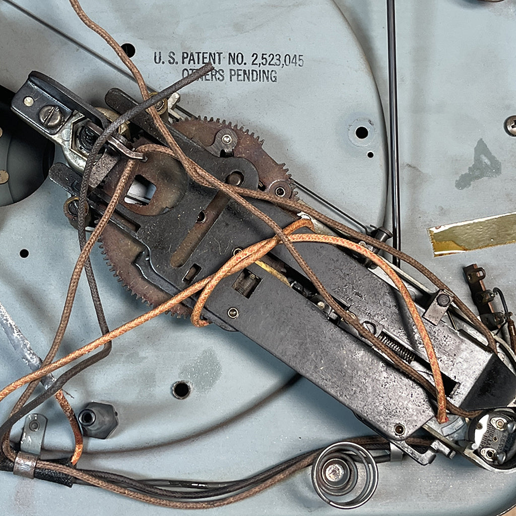The manufacturer for Voice of Music is V-M Products. They produced this Automatic Record Changer (ARC). Most of the phonograph radio consoles produced prior to the advent of the 33.3 (1948) and 45 RPM (1949) records were made with 78 RPM ARCs. For the may console owners at the that time, they removed the 78 RPM ARC and replaced it with an ARC that accepted all three record formats, like this model 950.